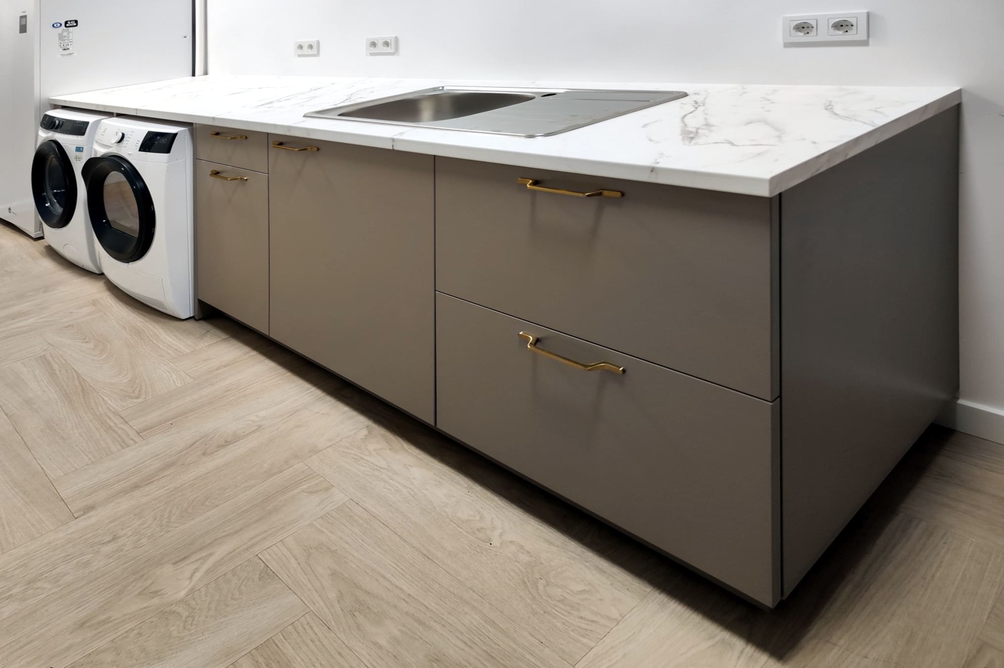 Ir vis tiek buvome maloniai nustebę, kai pamatėme surinktus baldus. Suvokėm, kad daug detalių net nebuvom apgalvoję ir už mus patogumą apgalvojot jūs: skirtingi vyriai, skirtingi atidarymo mechanizmai priklausomai nuo vietos ir patogumo, spintelės ir durelių plotis, kad atidarius durelės nesiektų lubų difuzoriaus, ir pnš.. Vieninteliai maži trūkumai, kurių taip pat neapgalvojome: atidarius vienos spintos duris jos gali atsitrenkti į sieną, dviguba mažo tūrio šiukšlinė - nepasiieškojome, ką reiškia eskize buvęs pavadinimas.
